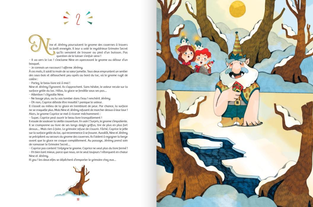 As Christmas approaches, Nine and Jeremy, two little elves, find a mysterious grimoire on a walk in the woods. Thanks to this magical book, they embark on an amazing journey from Blue Mountain to the Fairy Queen's High Palace, via Santa's workshop. Along the way, they meet many new people: the Christmas bird, Tantrum the gnome, Snowflake the fairy... and even Santa Claus, who entrusts them with a mission of the utmost importance!