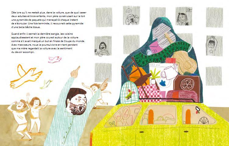 A little boy looks back on the most important journeys of his childhood: going on vacation, coming back to his hometown! He chooses a particular angle: his mother's habit of accumulating all sorts of gifts over the course of the year, in response to family requests. He recounts the stores where she and her sisters would drag them, the phone calls back home and the drawings she made to make sure she did not forget anything. And so, they lived among these colourful packages for most of the year, until the day they left. Then it was her father's turn to display his talents: he always managed to fit all the presents into the car or onto its roof, forming an unstable pyramid. The journey could then begin, and it wasn't long before other equally loaded cars joined them on the road to Spain and then Morocco. A truly motley convoy!