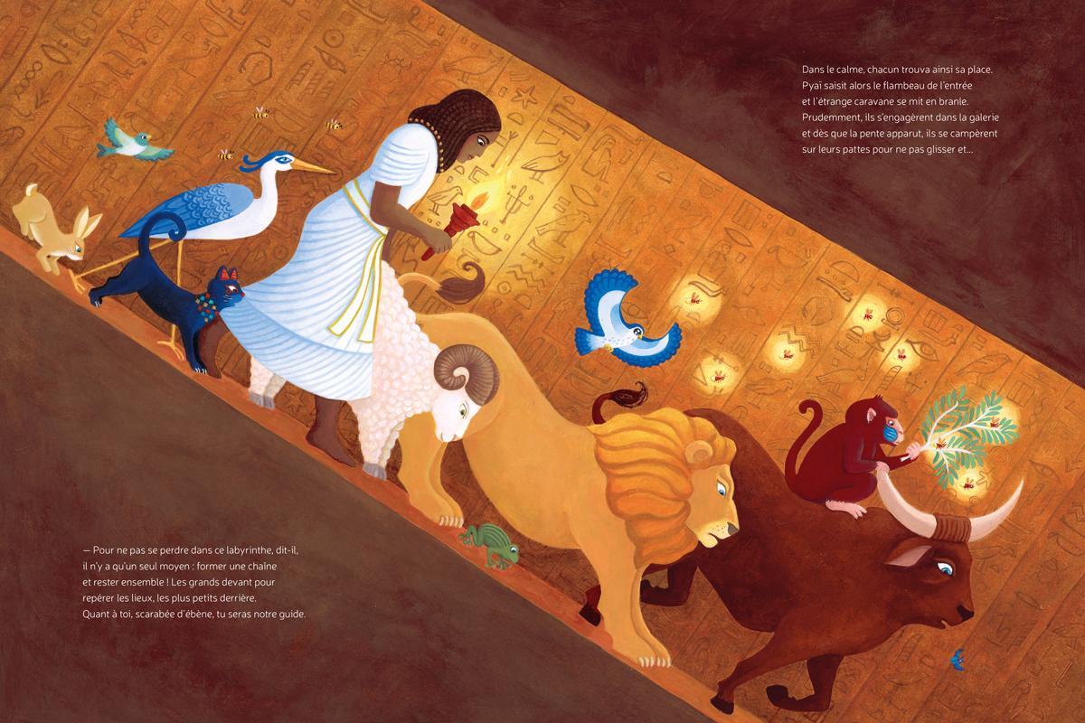 Instead of taking a nap, Little Noun prefers to go and see the pyramids. Small from the river, they turn out to be real mountains of stone. On one of them, still under construction, men are hard at work. There he meets his friend Pyaï, who tells him that the pyramids hide many secrets. Taking advantage of the workers’ departure, Little Noun slips inside. But then he starts sliding, sliding... until he lands in complete darkness. He calls for help! But no one hears him. No one? Yes! A scarab beetle. It quickly goes to warn his friends. Armed with a torch and accompanied by fireflies, Pyaï and the animals manage to find the little hippo—and there, what a marvellous treasure! The walls are covered with magnificent frescoes. In the end, they all make it out safe and sound.
