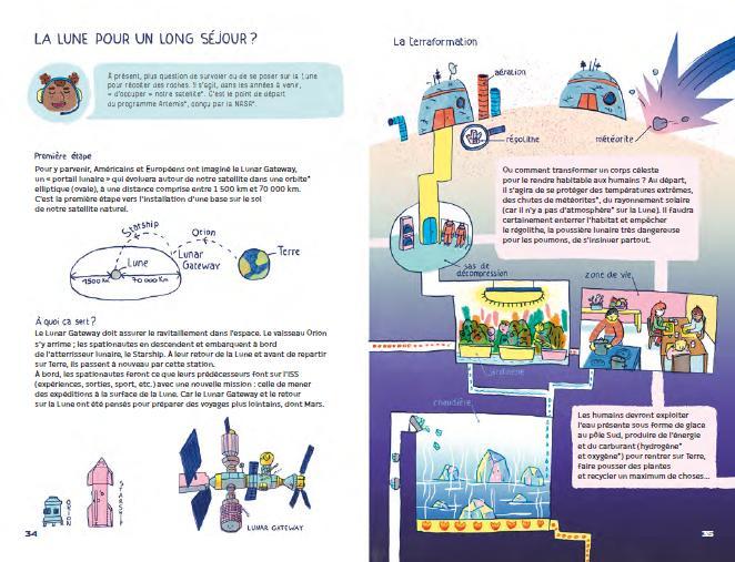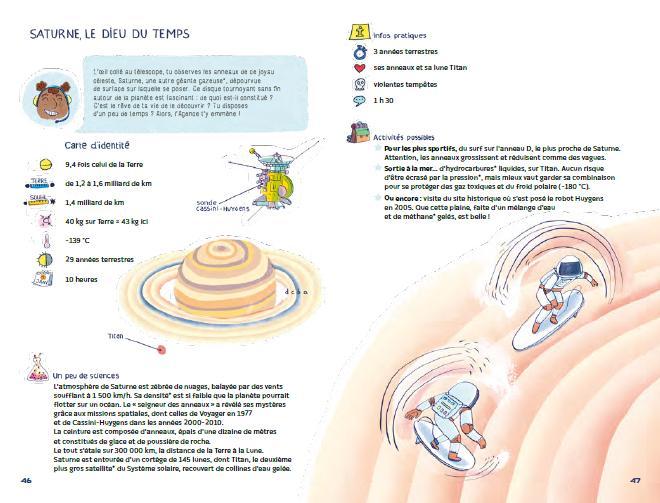 The book begins by introducing the preparations needed for a space adventure: health tips, essential equipment, and transport options. Next, it invites readers to explore the Moon and each planet of the Solar System through informative sheets that blend scientific facts with playful suggestions. Observe Olympus Mons on Mars, skate on one of Jupiter’s moons, or stay aboard an airship above Venus — space exploration becomes a game!