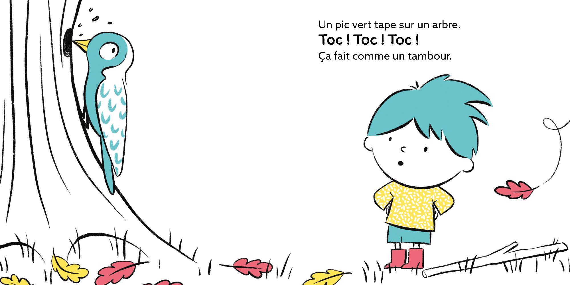 Content : A green woodpecker taps on a tree. Tap! Tap! Tap! It sounds like a drum. Eli taps too. Bam Boom Bang! Boom Bang Bam!