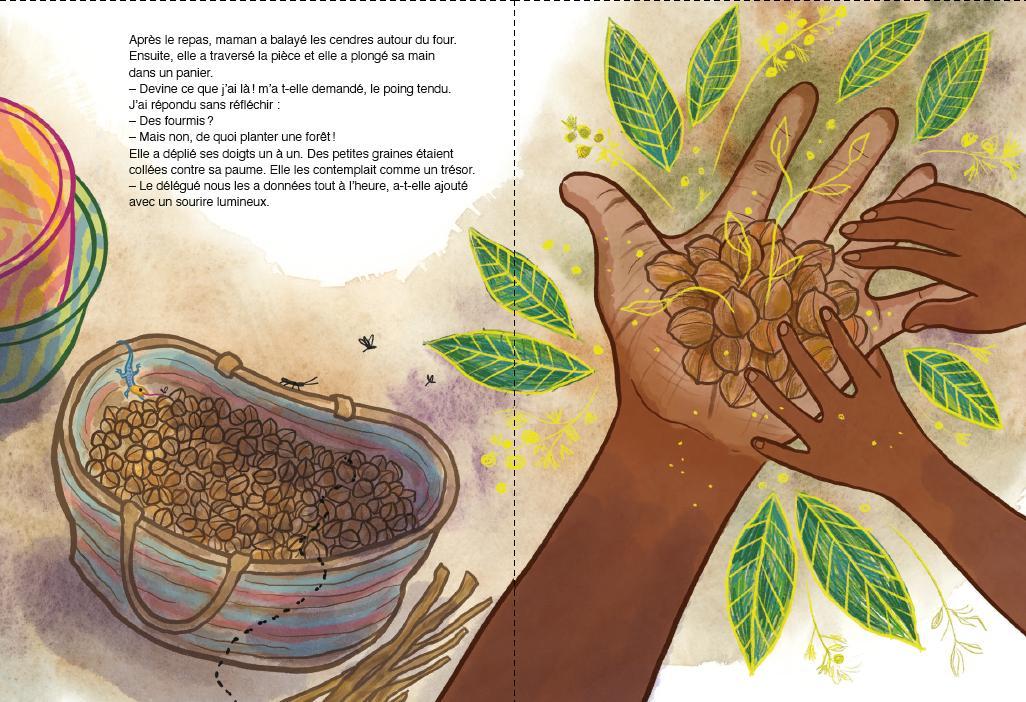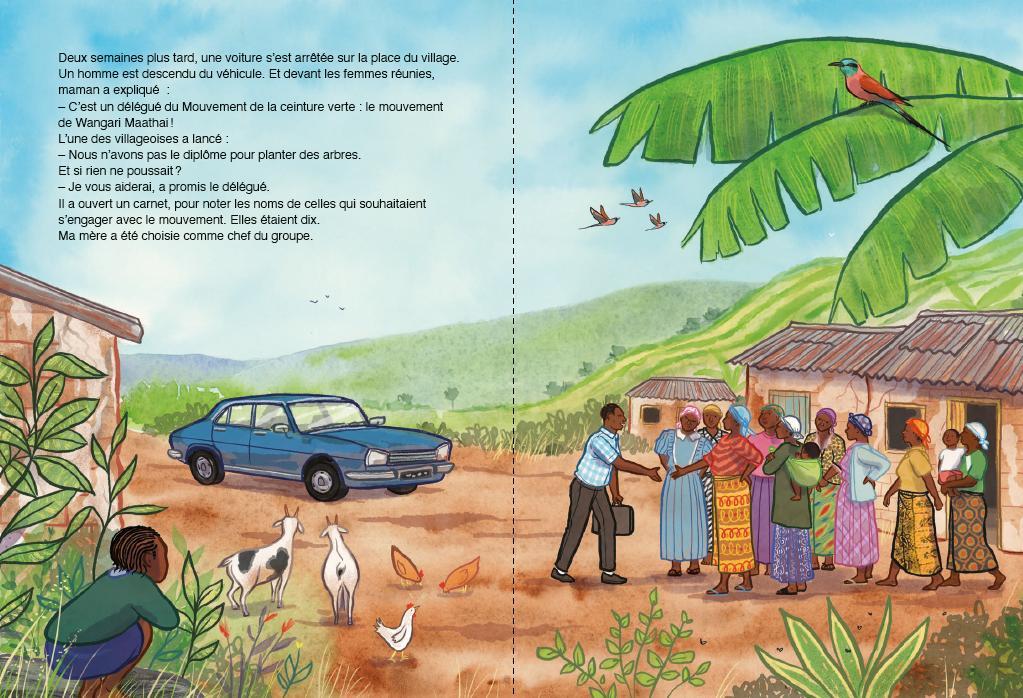 One evening, Wanjiru sees her mother returning home, her eyes shining with incredible news: a woman, Wangari Maathai, is inviting the village women to join a reforestation movement — the Green Belt Movement. Together, they will plant trees, learn how to grow seedlings, and be paid for every sapling that survives.