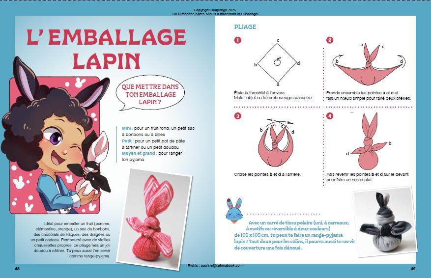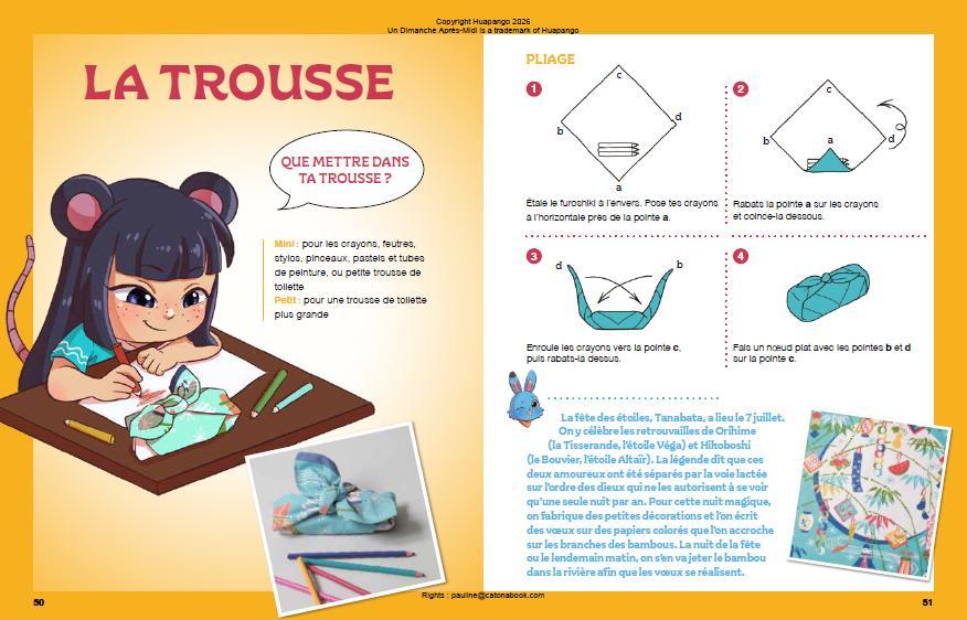 What is inside this book: over 20 step-by-step creations. Aurélie Le Marec, founder of L'Atelier du Furoshiki and a long-time school instructor, has designed this guide especially for children. Each technique is explained with clear, colourful illustrations that make learning truly accessible.