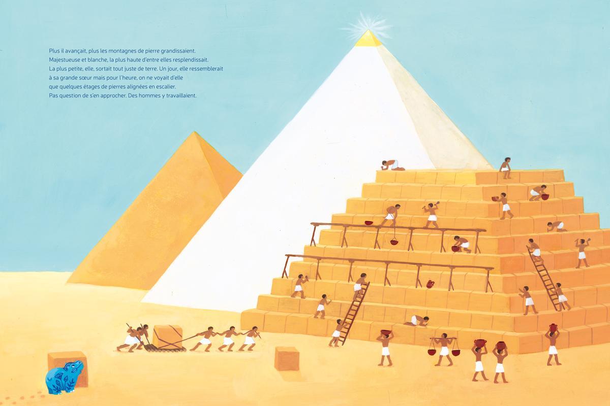 Instead of taking a nap, Little Noun prefers to go and see the pyramids. Small from the river, they turn out to be real mountains of stone. On one of them, still under construction, men are hard at work. There he meets his friend Pyaï, who tells him that the pyramids hide many secrets. Taking advantage of the workers’ departure, Little Noun slips inside. But then he starts sliding, sliding... until he lands in complete darkness. He calls for help! But no one hears him. No one? Yes! A scarab beetle. It quickly goes to warn his friends. Armed with a torch and accompanied by fireflies, Pyaï and the animals manage to find the little hippo—and there, what a marvellous treasure! The walls are covered with magnificent frescoes. In the end, they all make it out safe and sound.
